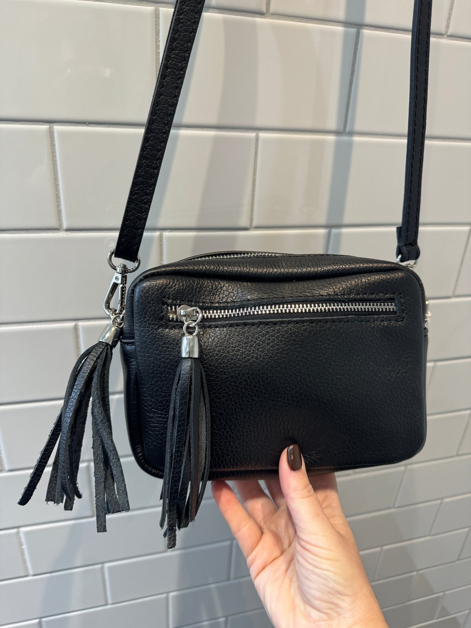 Our bestselling GENUINE LEATHER cross body bag. CAPRI features 2 tassels, a main zip pocket and front zip pocket and removable/ adjustable/ interchangeable shoulder straps.