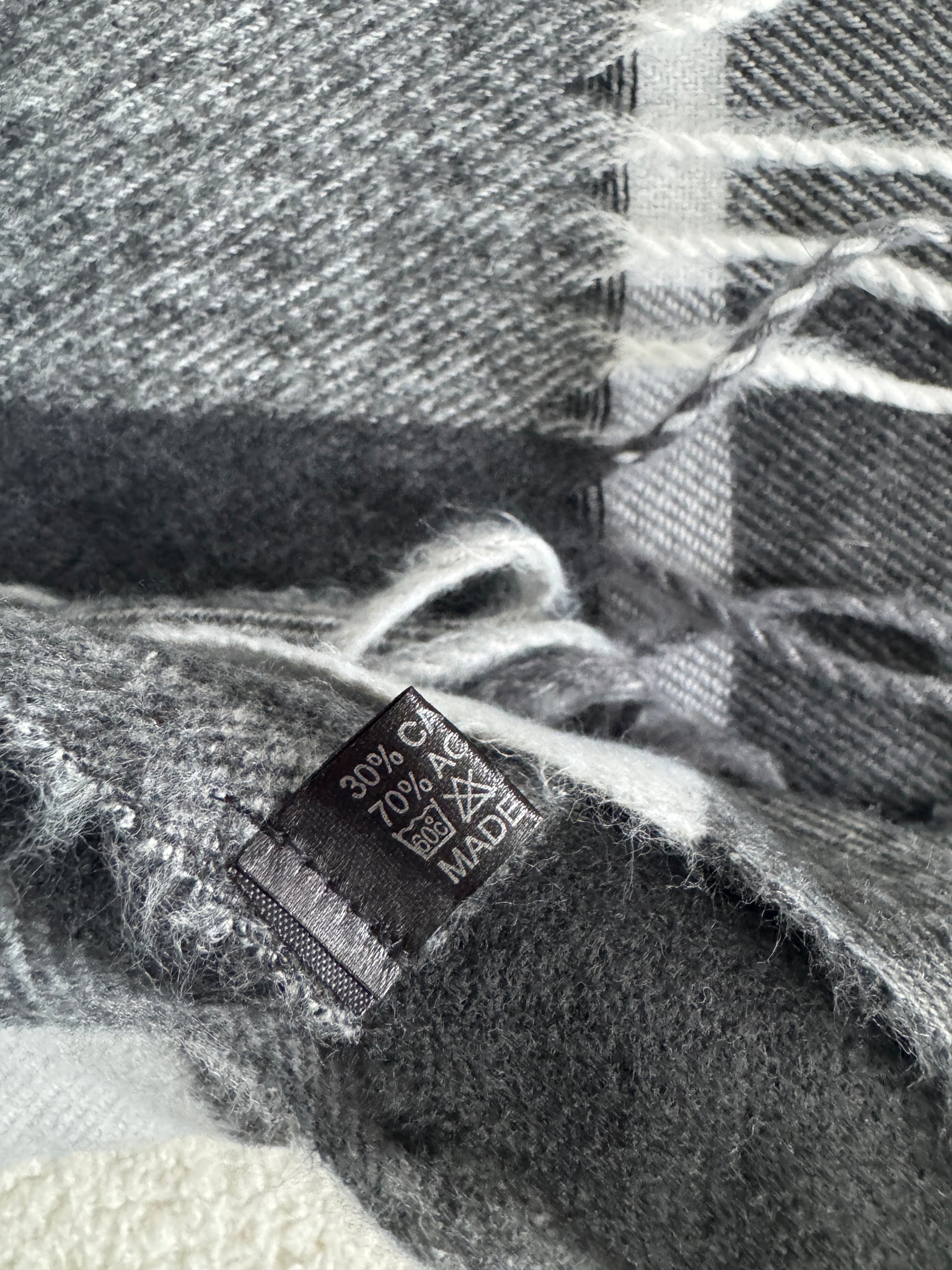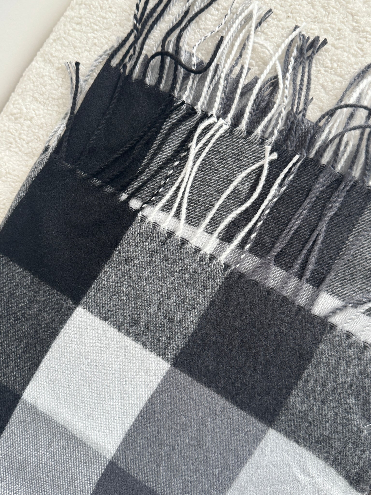 Made from a luxurious cashmere blend, this grey checked scarf is both soft and stylish. Its neutral design allows it to pair effortlessly with any outfit. Stay warm and elegant with this must-have accessory.