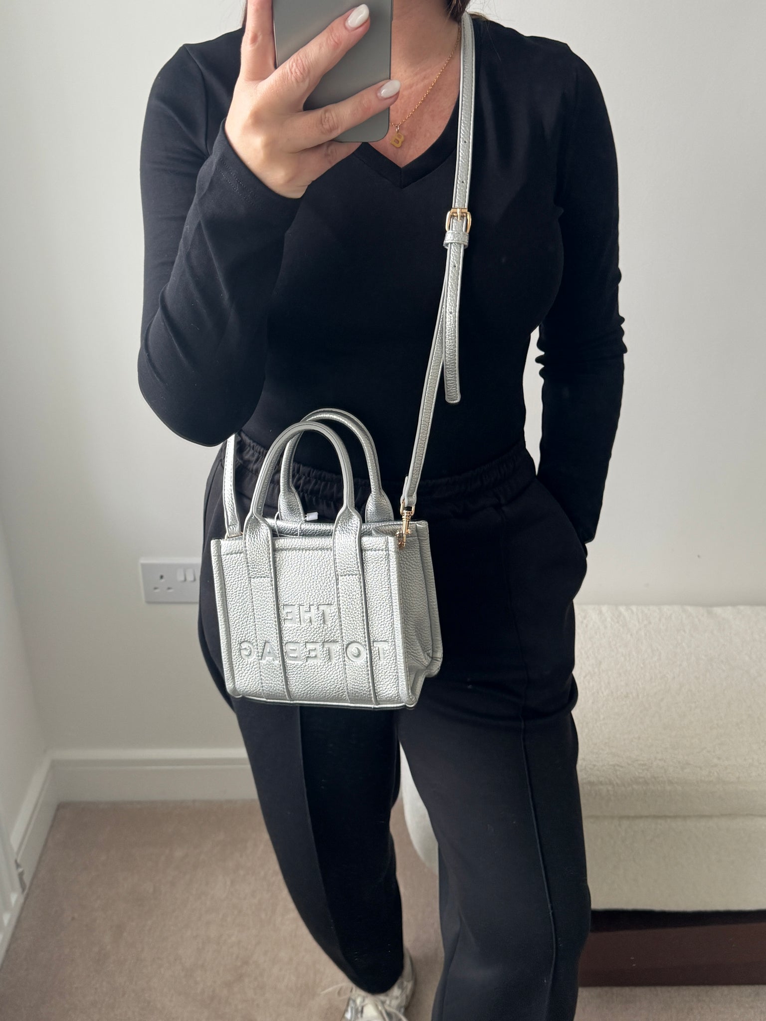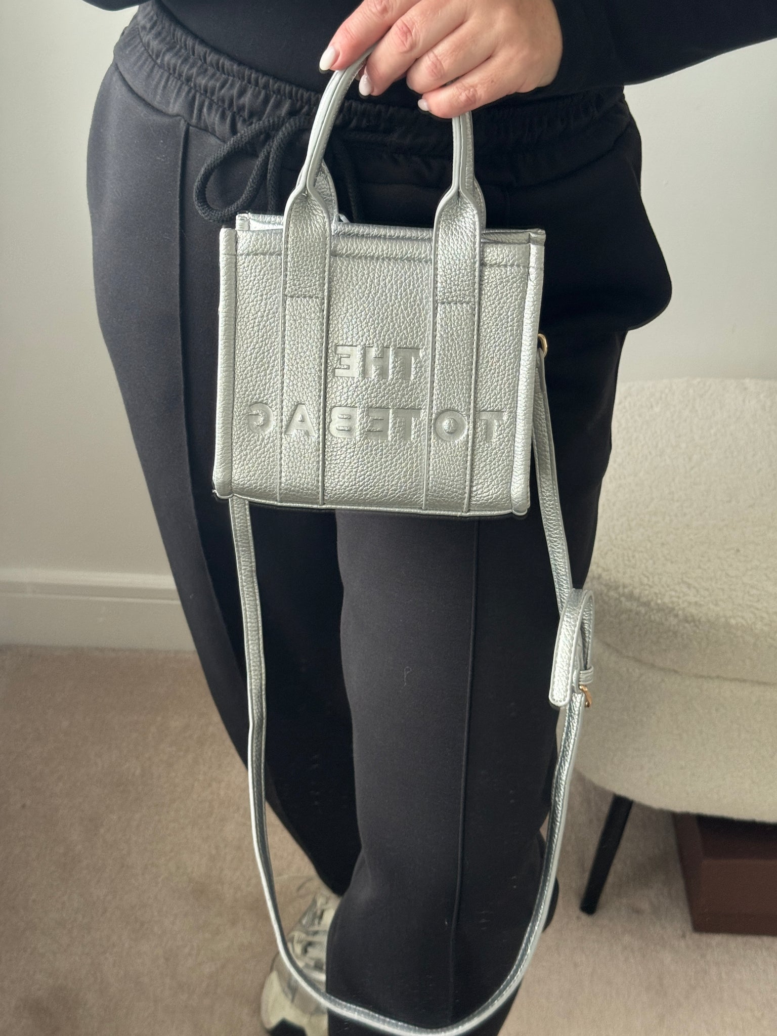 Mini Tote cross body bag with top handle and cross bag strap. Zip top and inner zip compartment.