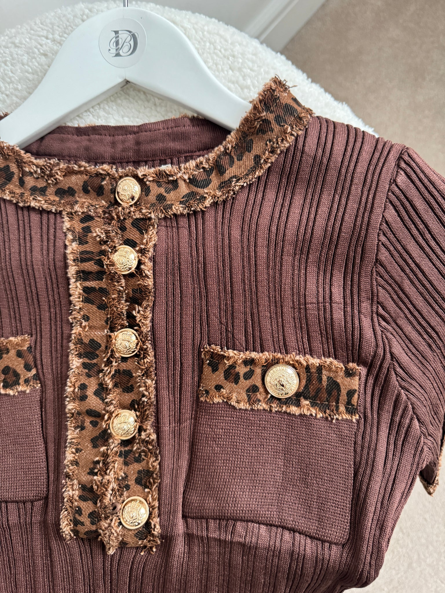 As a perfect choice for a smart yet comfortable look, the REBECCA V Ribbed Top features functional gold buttons, contrast leopard trim, round neckline. Made with a cosy rib knit, this top is both stylish and practical, offering both fashion and functionality. Elevate your wardrobe with this versatile and chic piece.