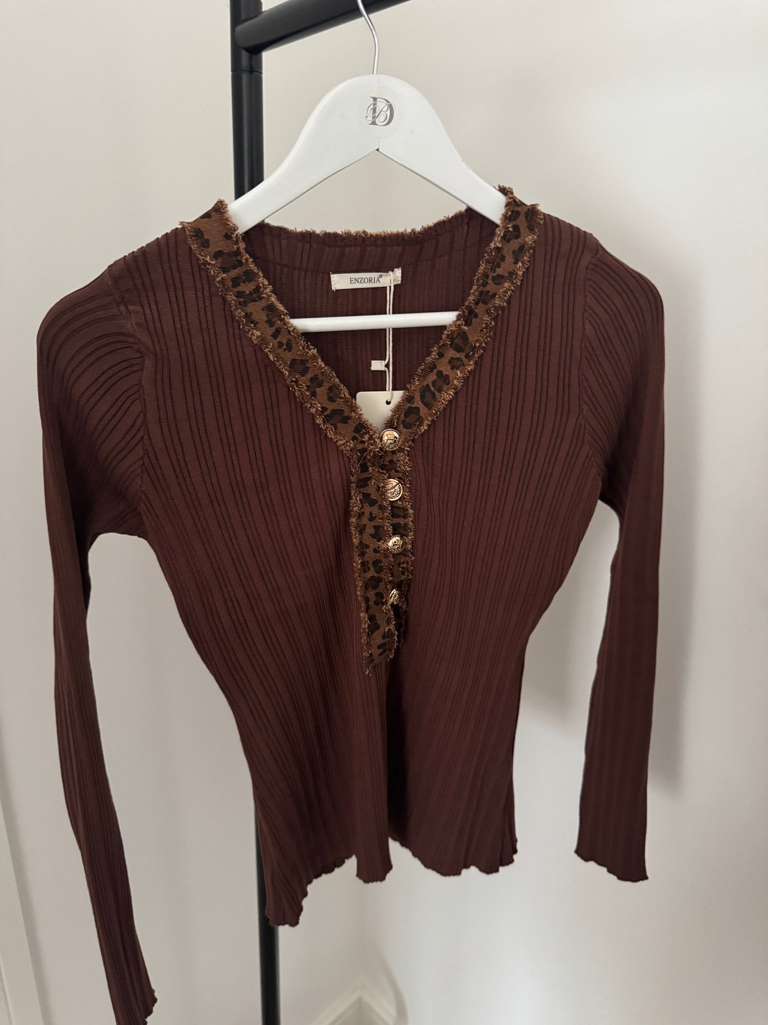 As a perfect choice for a smart yet comfortable look, the REBECCA V Ribbed Top features functional gold buttons, contrast leopard trim, and a flattering V-neckline. Made with a cosy rib knit, this top is both stylish and practical, offering both fashion and functionality. Elevate your wardrobe with this versatile and chic piece.
